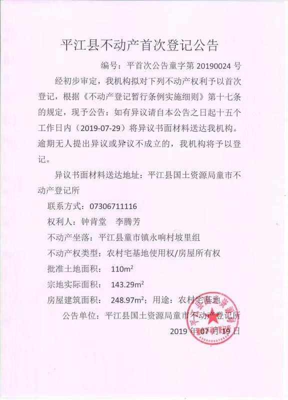 钟肯堂 李腾芳 平江县不动产首次登记公告 平首次公告童字第20190024号