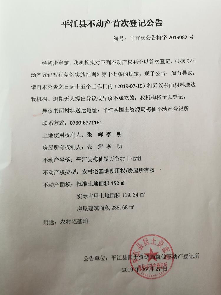张辉 李明 平江县不动产首次登记公告 平首次公告梅字2019082号