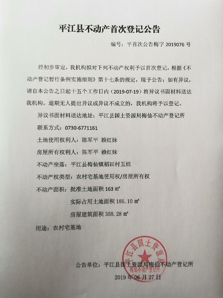 陈军平 赖红妹 平江县不动产首次登记公告 平首次公告梅字2019076号