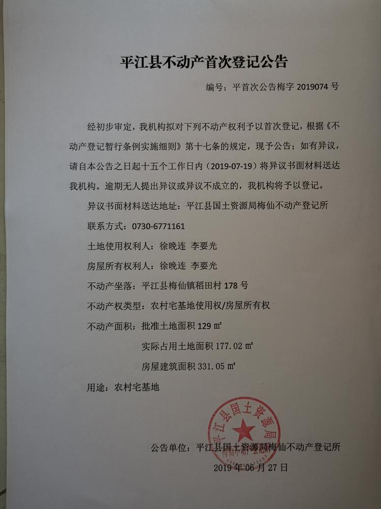 徐晚连 李要光 平江县不动产首次登记公告 平首次公告梅字2019074号