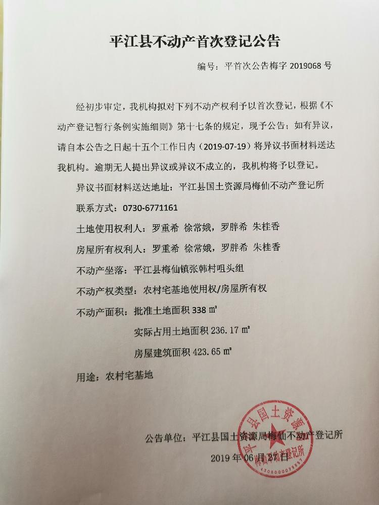 罗重希 徐常娥,罗胖希 朱桂香 平江县不动产首次登记公告 平首次公告梅字2019068号