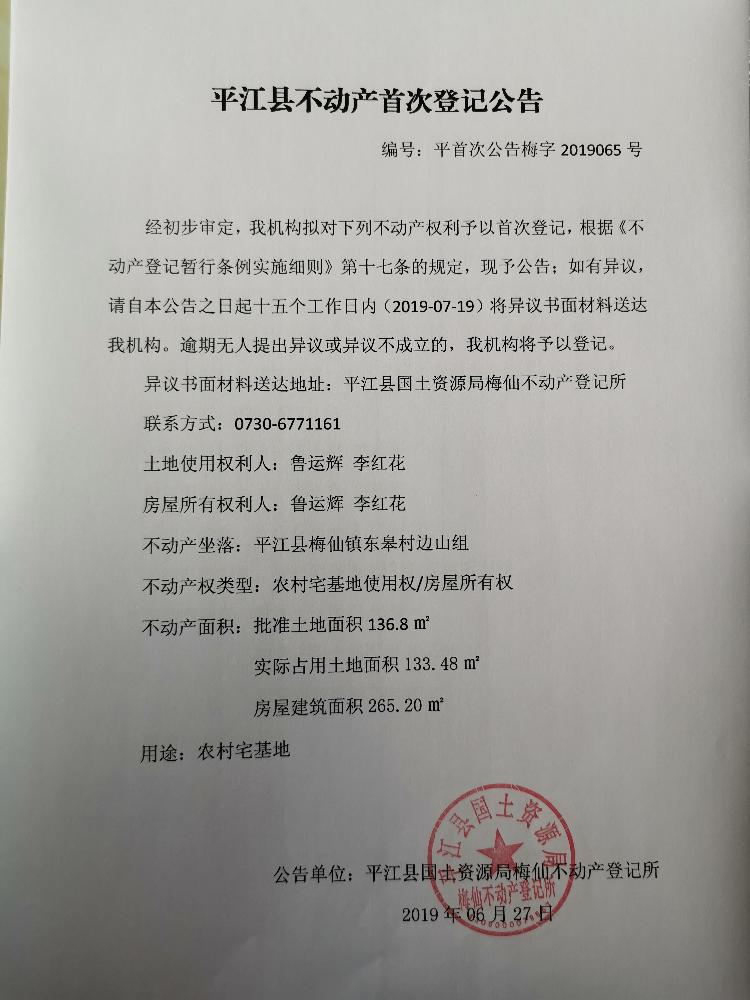 鲁运辉 李红花 平江县不动产首次登记公告 平首次公告梅字2019065号