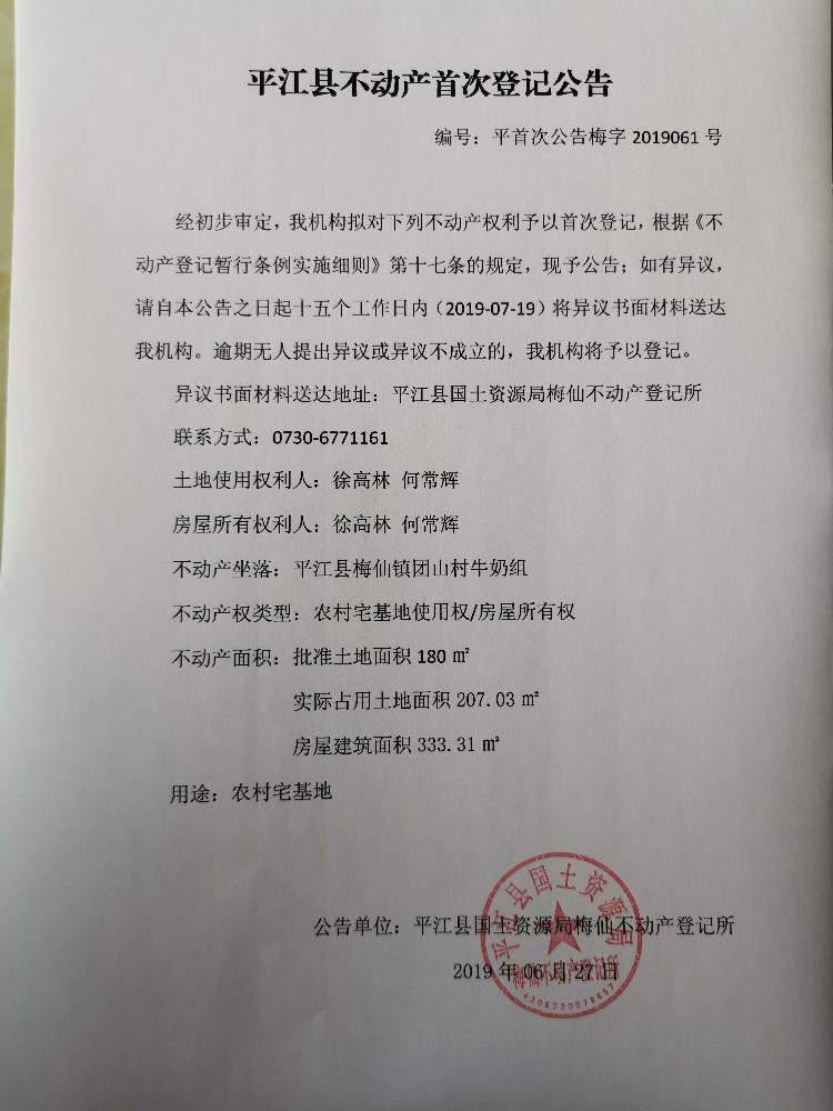 徐高林 何常辉 平江县不动产首次登记公告 平首次公告梅字2019061号