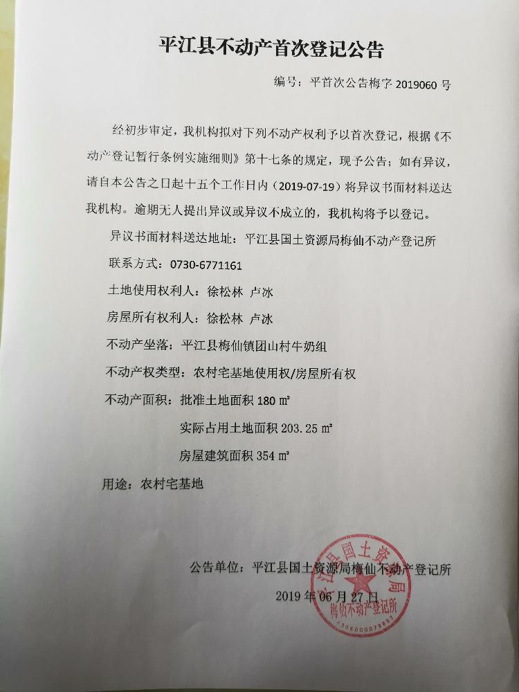 徐松林 卢冰 平江县不动产首次登记公告 平首次公告梅字2019060号