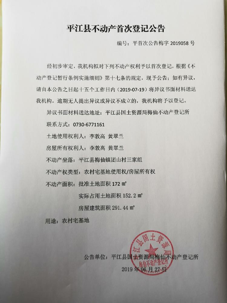 李敦高 黄翠兰 平江县不动产首次登记公告 平首次公告梅字2019058号