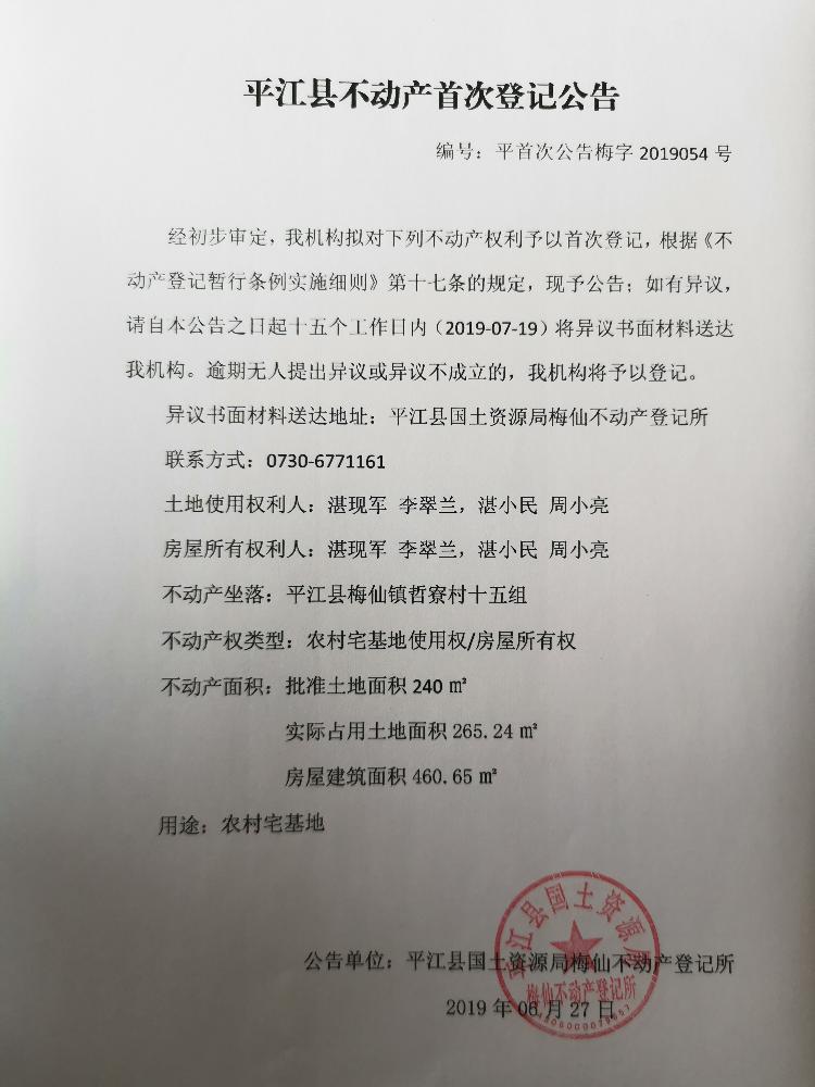 湛现军 李翠兰,湛小民 周小亮 平江县不动产首次登记公告 平首次公告梅字2019054号