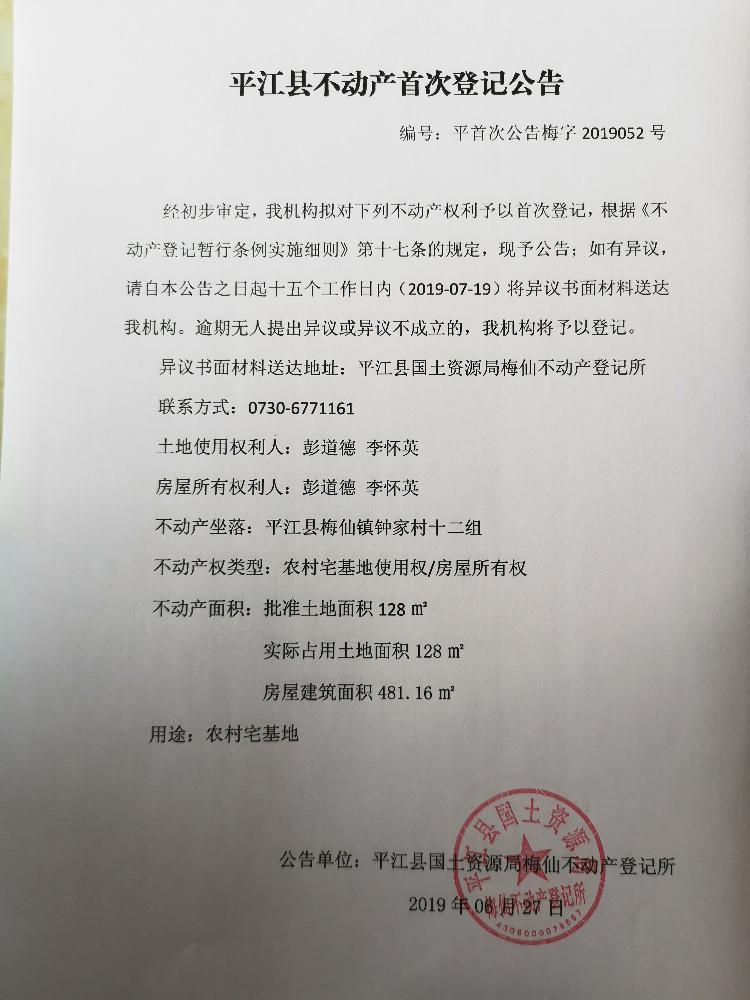 彭道德 李怀英 平江县不动产首次登记公告 平首次公告梅字2019052号