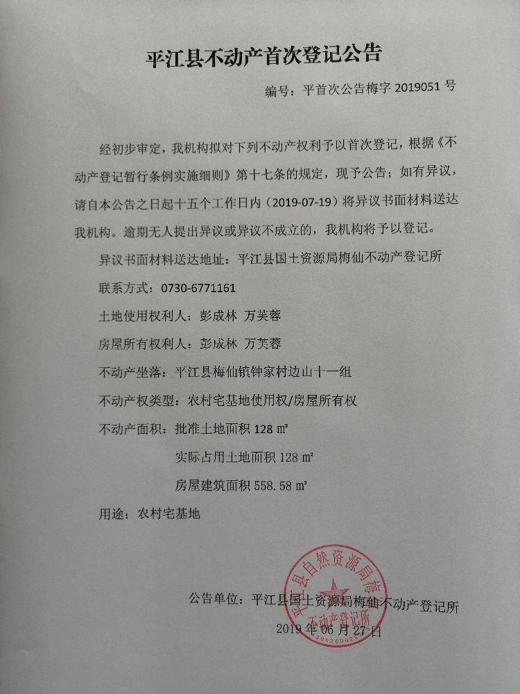 彭成林 万芙蓉 平江县不动产首次登记公告 平首次公告梅字2019051号