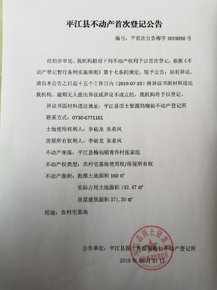 李裕龙 朱希风 平江县不动产首次登记公告 平首次公告梅字2019050号