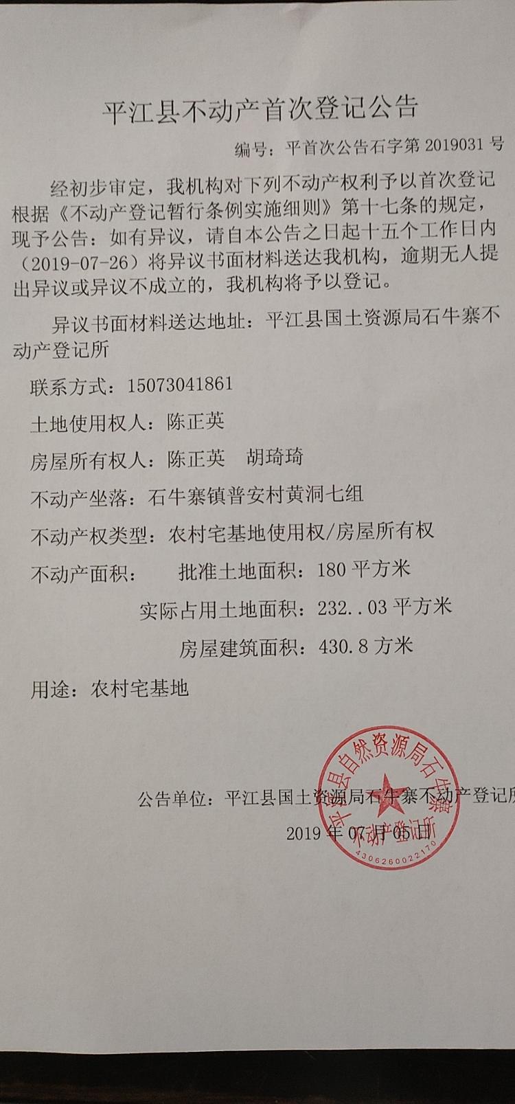 陈正英平江县不动产首次登记公告平首次公告石字第2019031号