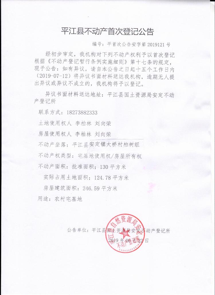 李柏林 刘向荣 平江县不动产首次登记公告 平首次公告安字第2019121号