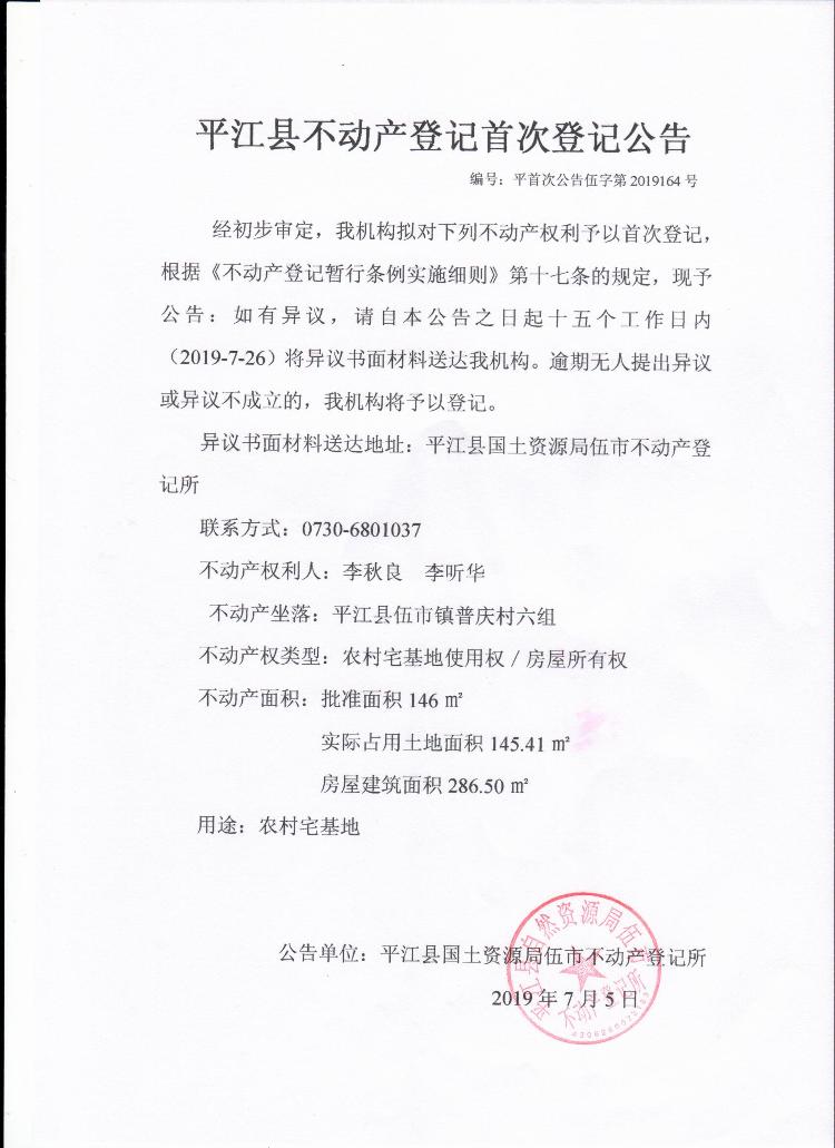 李秋良 李听华 不动产首次登记公告伍字第2019164号