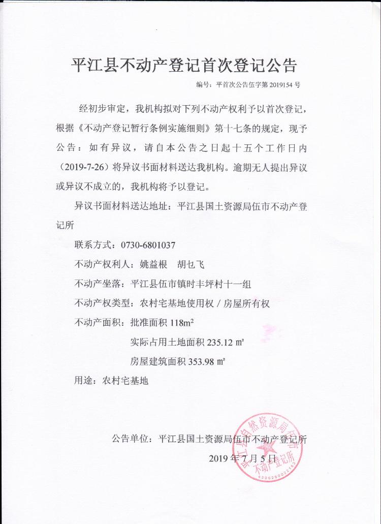 姚益根 胡乜飞 不动产首次登记公告伍字第2019154号
