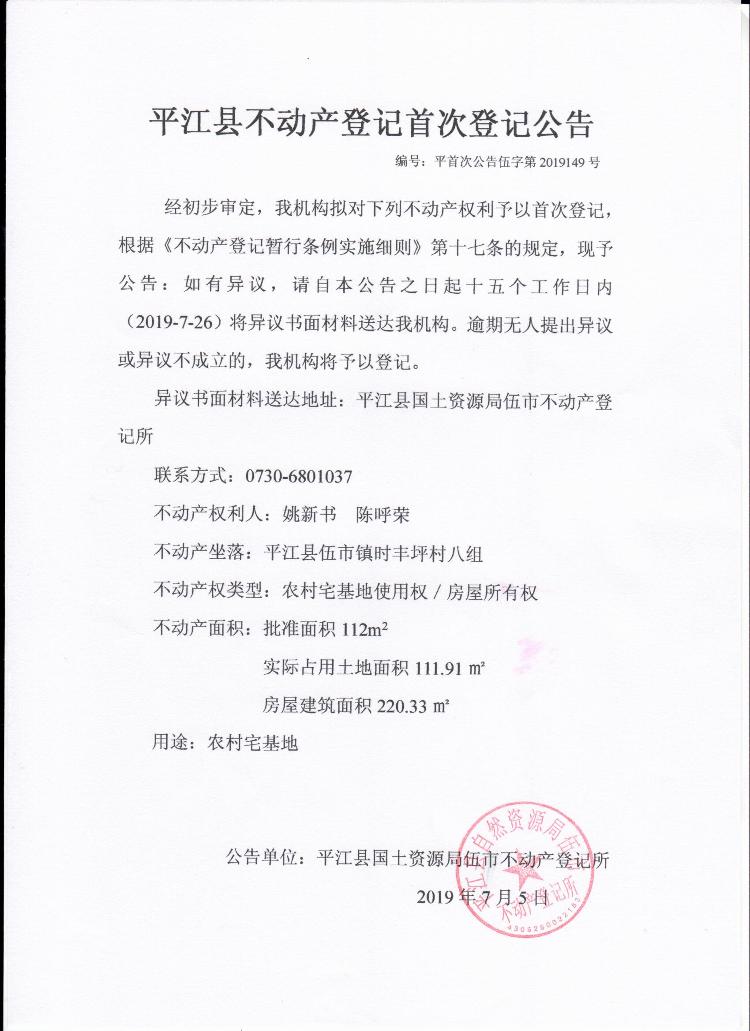 姚新书 陈呼荣 不动产首次登记公告 伍字第2019149号