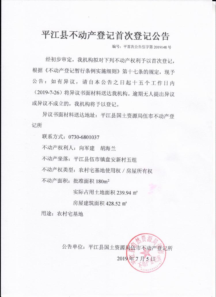 向军建 胡海兰平江县不动产首次登记公告伍字第2019148号