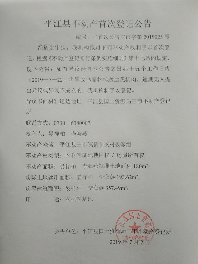 晏祥柏平江县不动产首次登记公告平首次公告三市字第2019025号