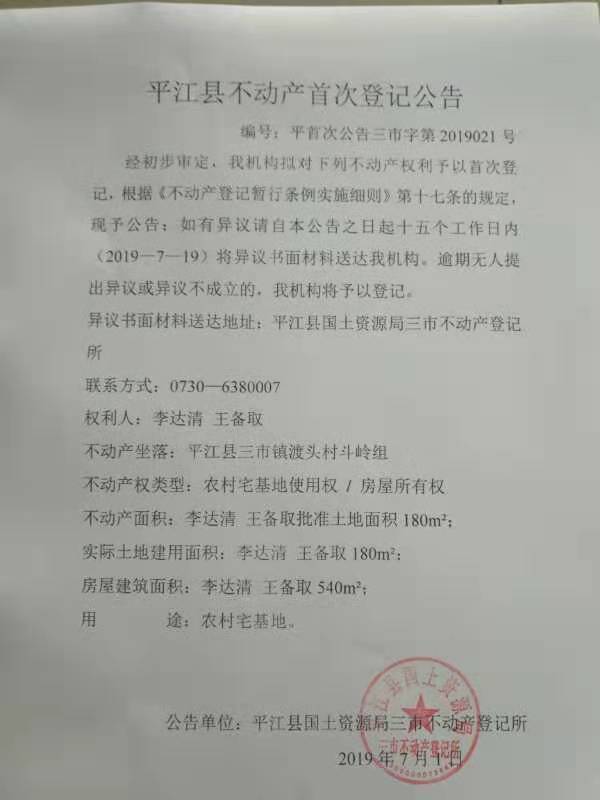李达清平江县不动产首次登记公告平首次公告三市字第2019021号