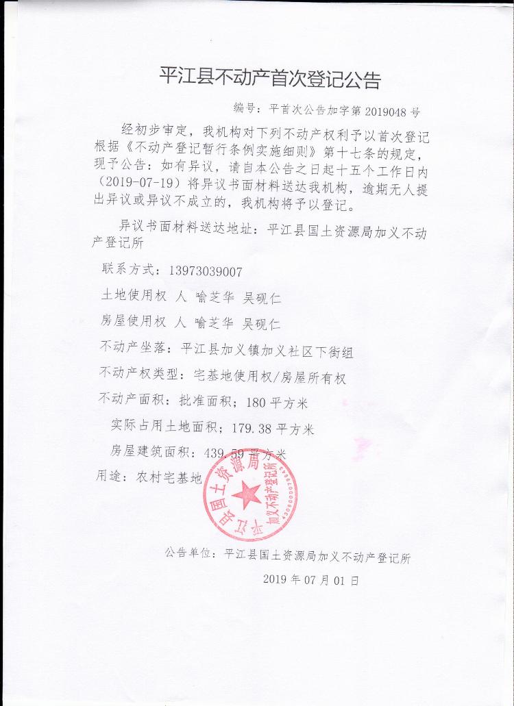 喻芝华 不动产首次登记公告平首次公告加字第2019048号