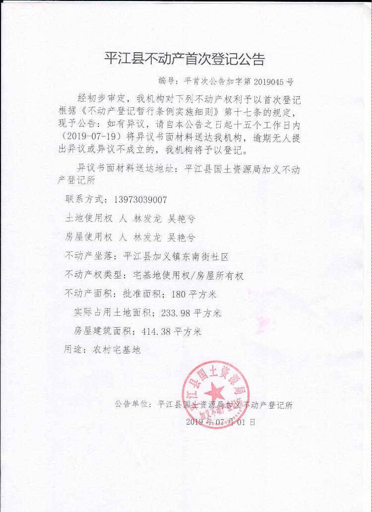 林发龙 不动产首次登记公告平首次公告加字第2019045号