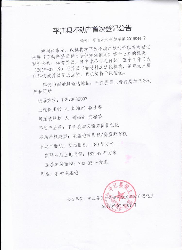 刘海宗 不动产首次登记公告平首次公告加字第2019044号