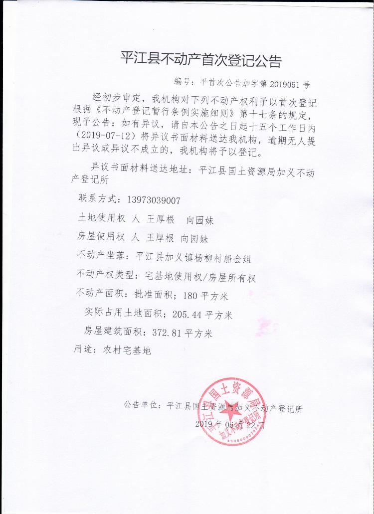 王厚根 不动产首次登记公告平首次公告加字第2019051号
