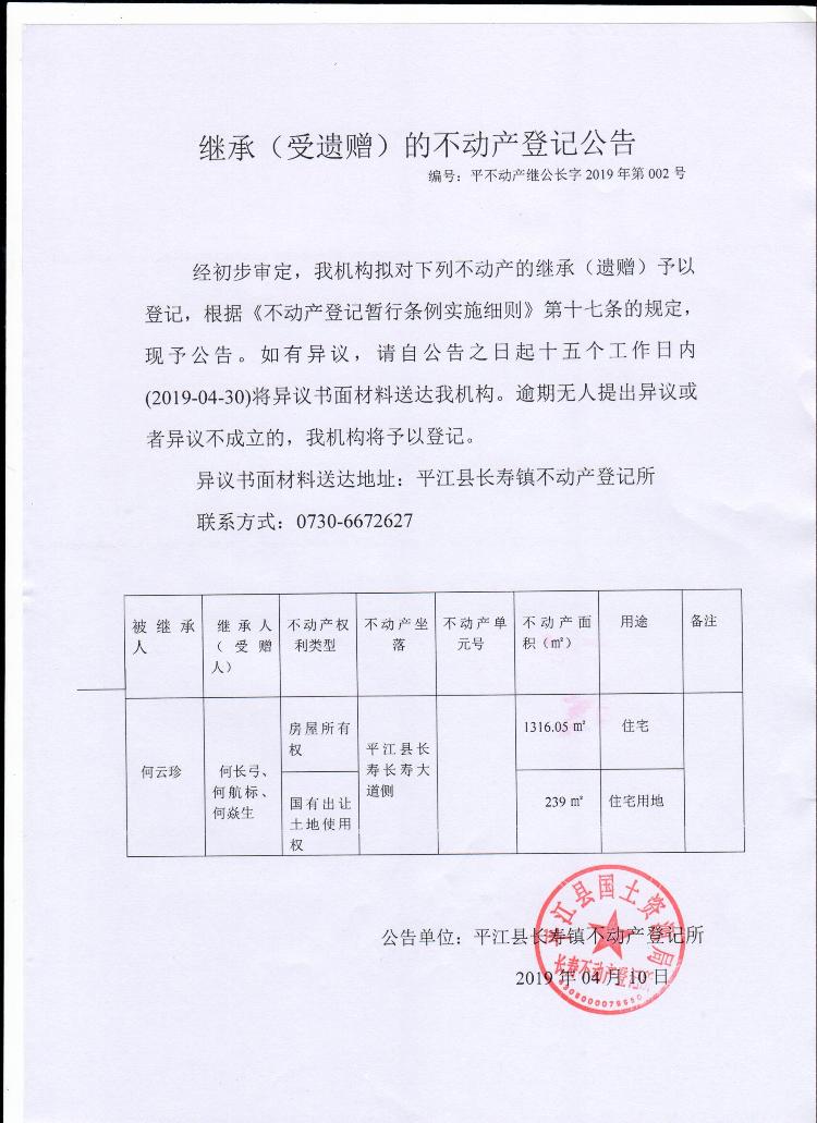 何长弓、何航标、何焱生继承(受遗赠)的不动产登记公告平不动产继长公字2019年第002号