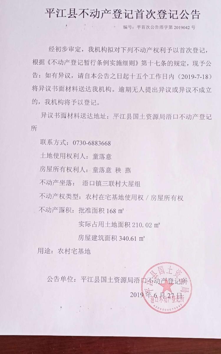 童落意平江县不动产首次登记公告平首次公告浯字第2019042号