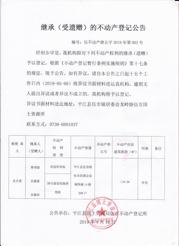 覃秀丽 吴嘉豪 吴豪欣 继承(受遗赠)不动产登记公告伍不动产继公字2019年003号
