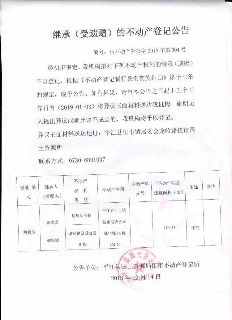 蓝宏瑛 姚枳羽 继承(受遗赠)不动产登记公告 伍不动产继公字第2018年第004号
