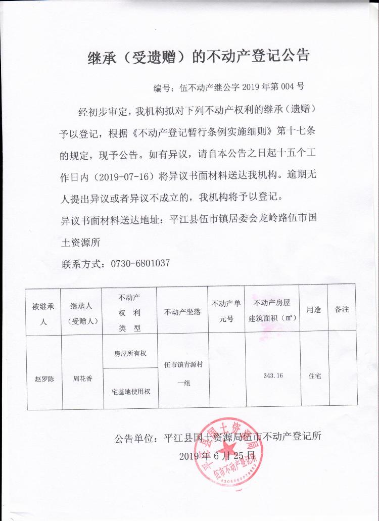 周花香继承(受遗赠)不动产登记公告 伍不动产继公字2019年第004号