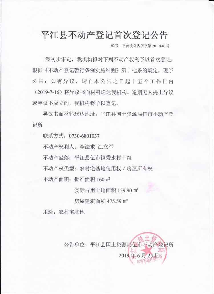 李法求 江立军 不动产首次登记公告 平首次公告伍字第2019146号