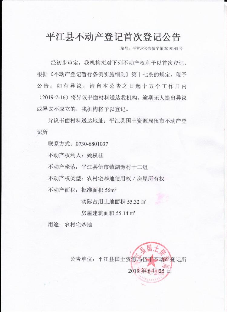 姚权桂 不动产首次登记公告 平首次公告伍字第2019145号