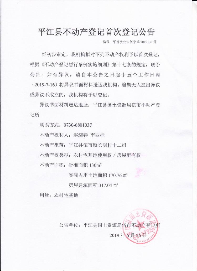 赵迎春 李四桂 不动产首次登记 平首次公告伍字第2019138号
