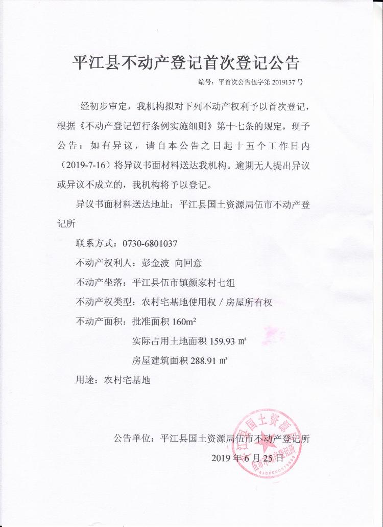彭金波 向如意 不动产首次登记公告 平首次公告伍字第2019137号
