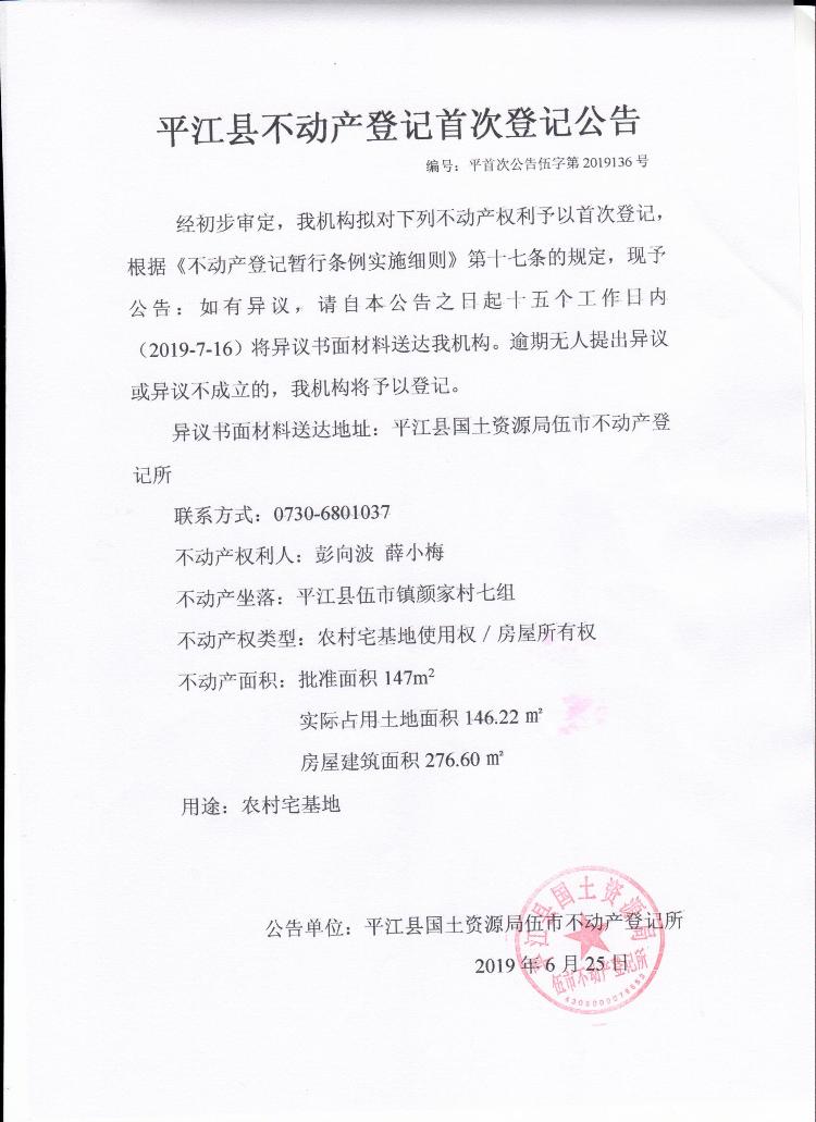 彭向波 薛小梅 不动产首次登记 平首次公告伍字第2019136号