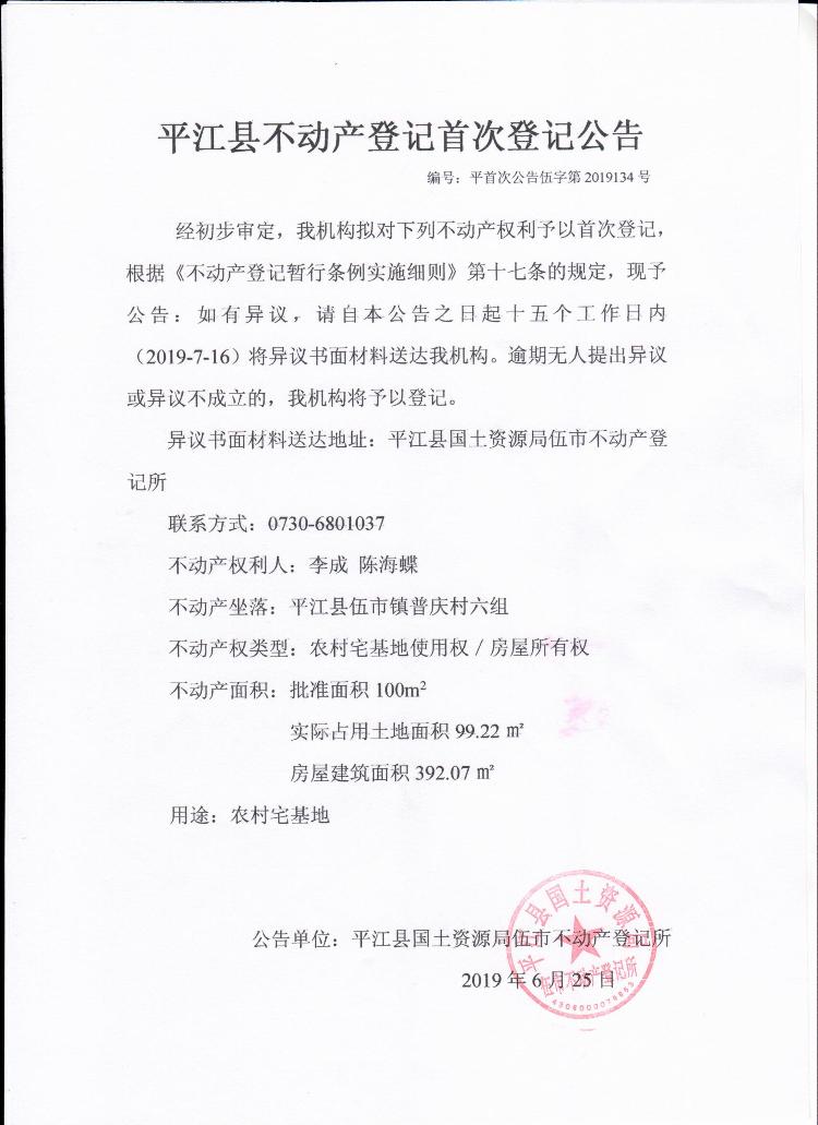 李成 陈海蝶 不动产首次登记公告 平首次公告伍字第2019134号