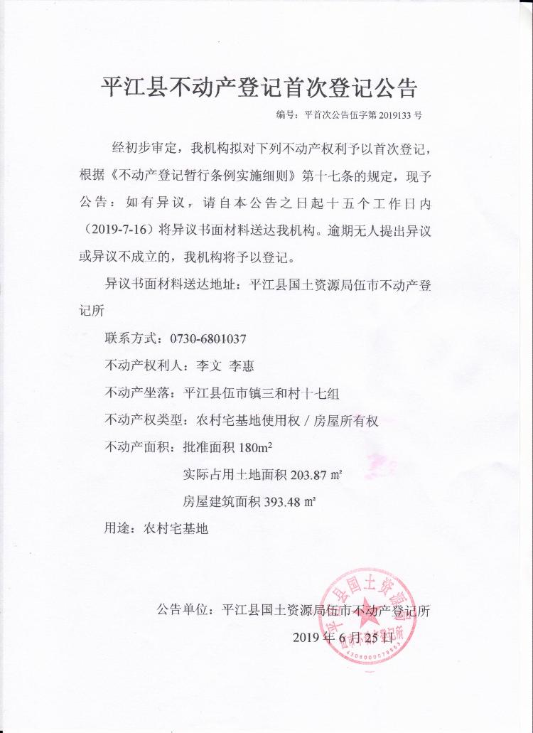 李文 李惠 不动产首次登记公告 平首次公告伍字第2019133号