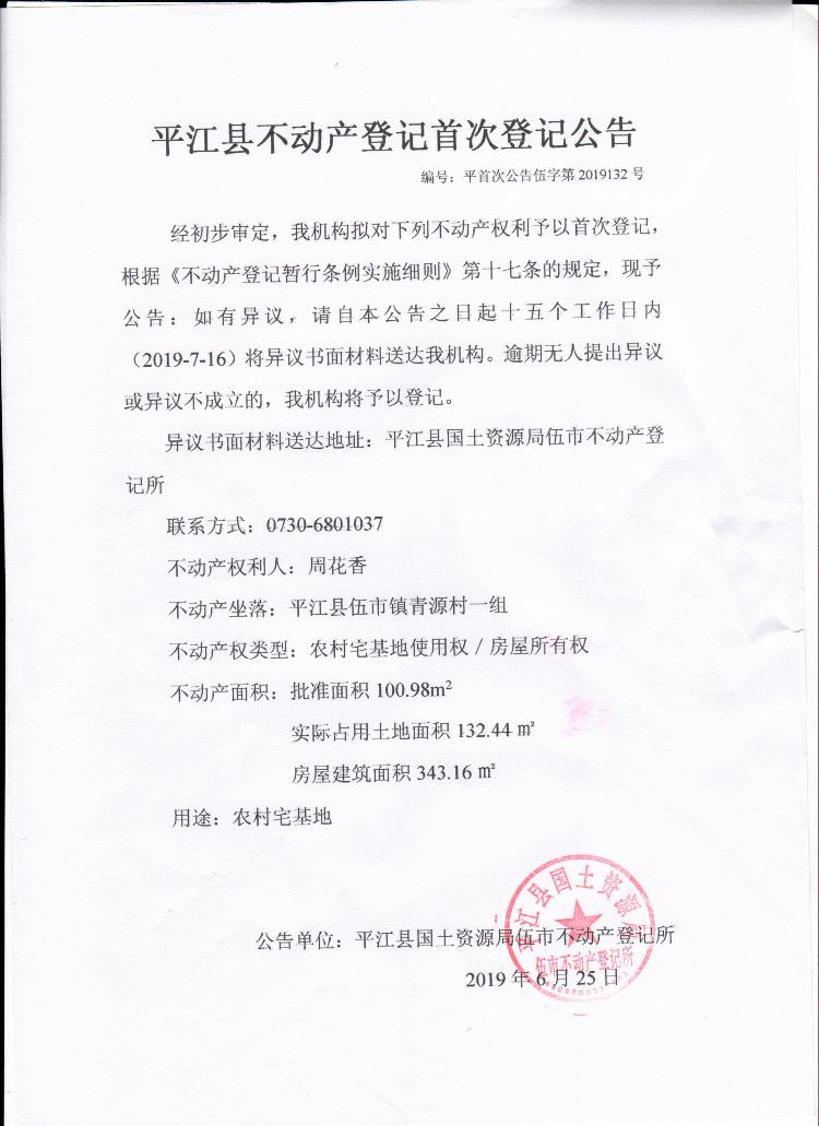 周花香 不动产首次登记公告平首次公告伍字第2019132号