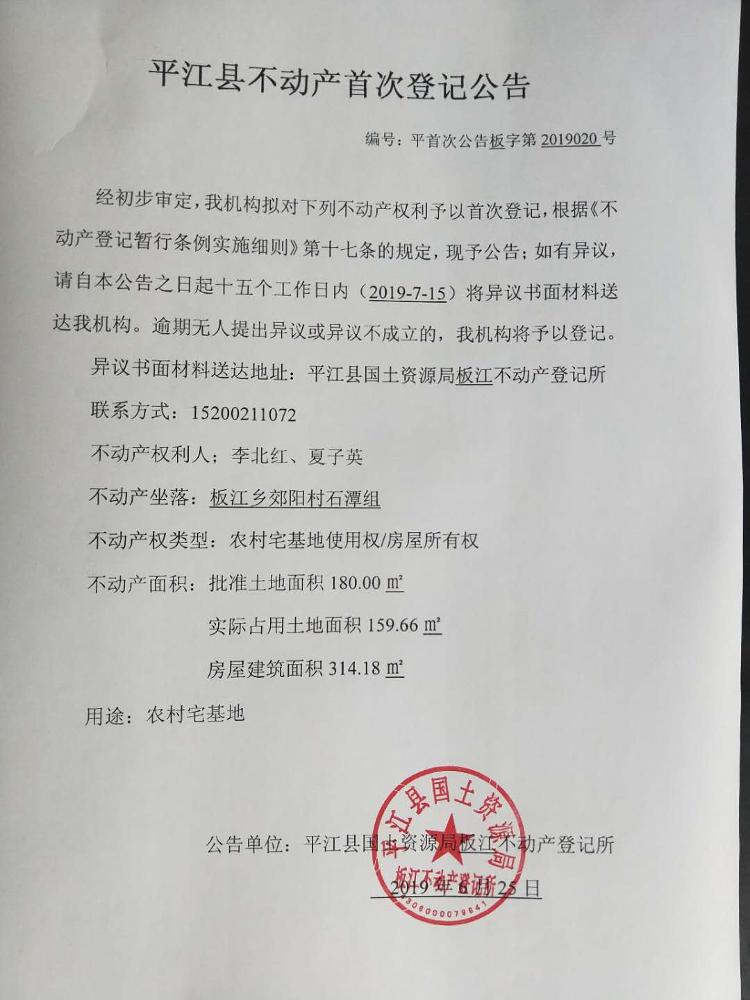 李北红 夏子英平江县不动产首次登记公告平首次公告板字第2019020号