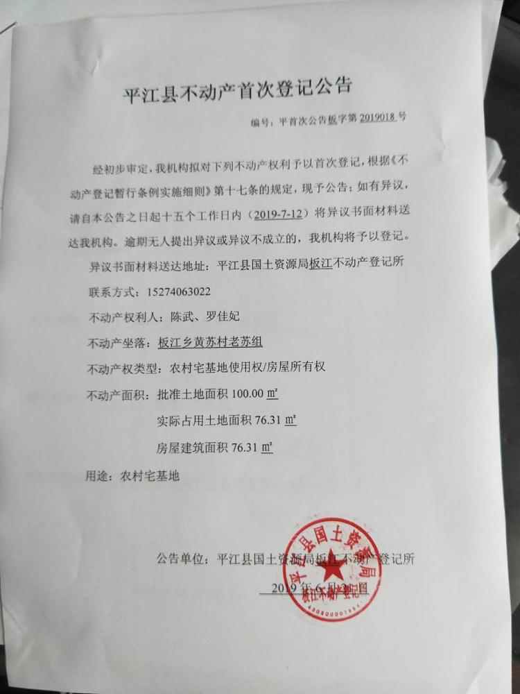 陈武 罗佳妃平江县不动产首次登记公告平首次公告板字第2019018号