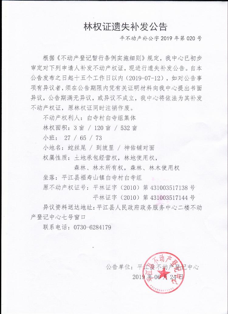 白寺村白寺组集体林权证遗失补发公告平不动产补公字2019年第020号