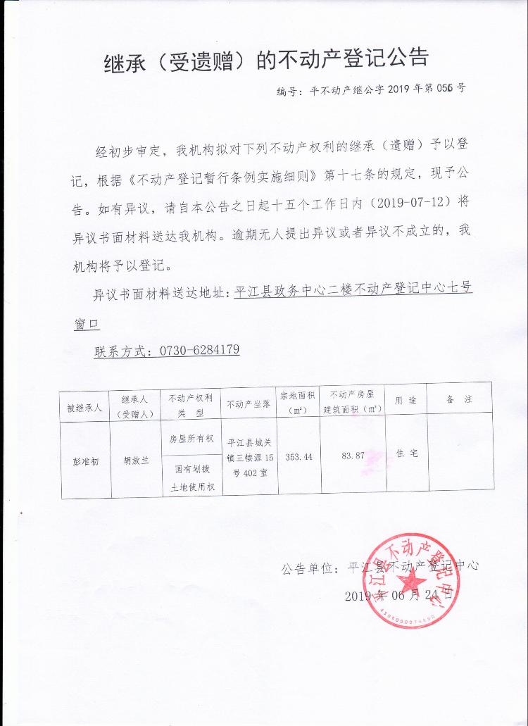 胡放兰继承(受遗赠)的不动产登记公告平不动产继公字2019年第056号