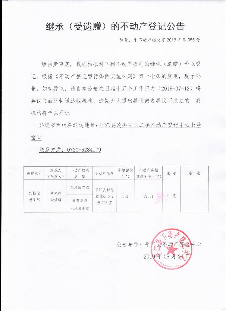 刘武林 余媚辉继承(受遗赠)的不动产登记公告平不动产继公字2019年第055号