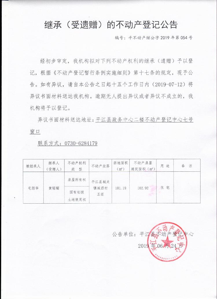 黄姗姗继承(受遗赠)的不动产登记公告平不动产继公字2019年第054号