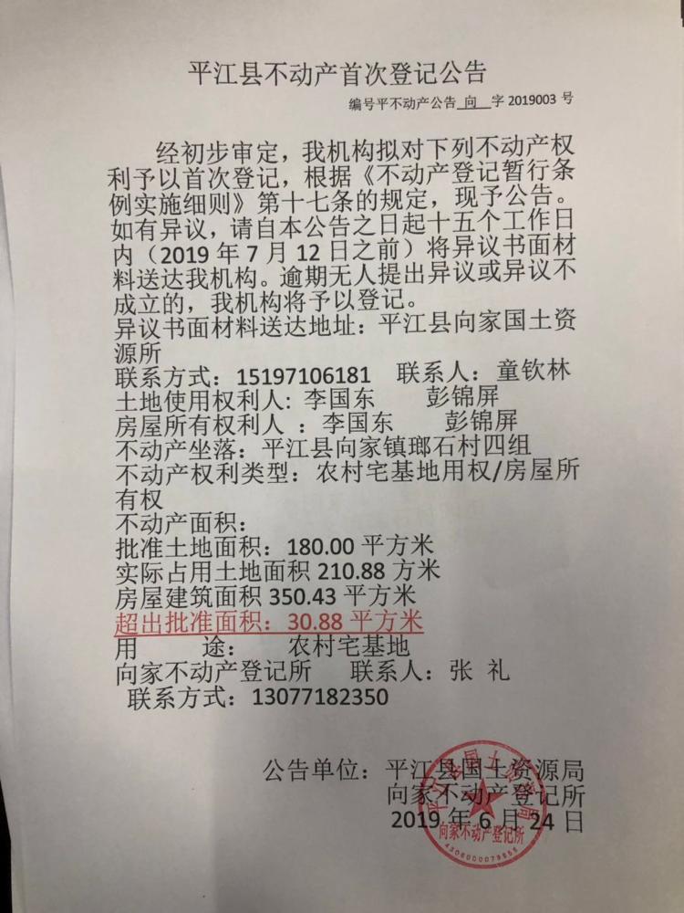 李国东 彭锦屏平江县不动产首次登记公告平不动产公告向字2019003号