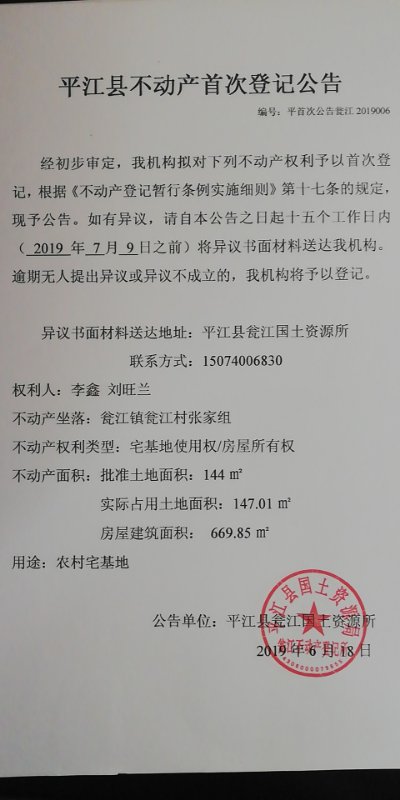 李鑫 刘旺兰平江县不动产首次登记公告平首次公告瓮江2019006号