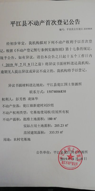 彭芳然 凌妹华平江县不动产首次登记公告平首次公告瓮江2019004号