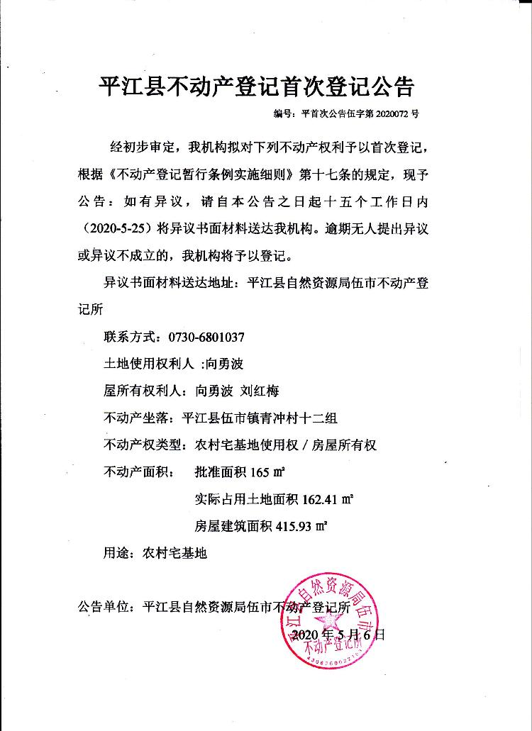 向勇波 刘红梅 平江县不动产首次登记公告伍字第2020072号