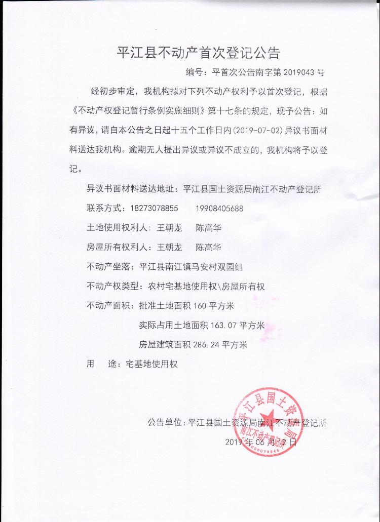 王朝龙 陈高华平江县不动产首次登记公告平首次公告南字第2019043号