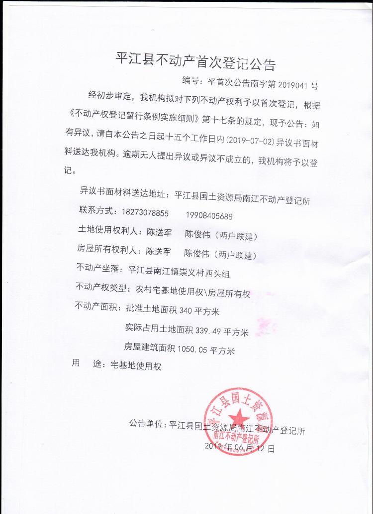 陈送军 陈俊伟平江县不动产首次登记公告平首次公告南字第2019041号